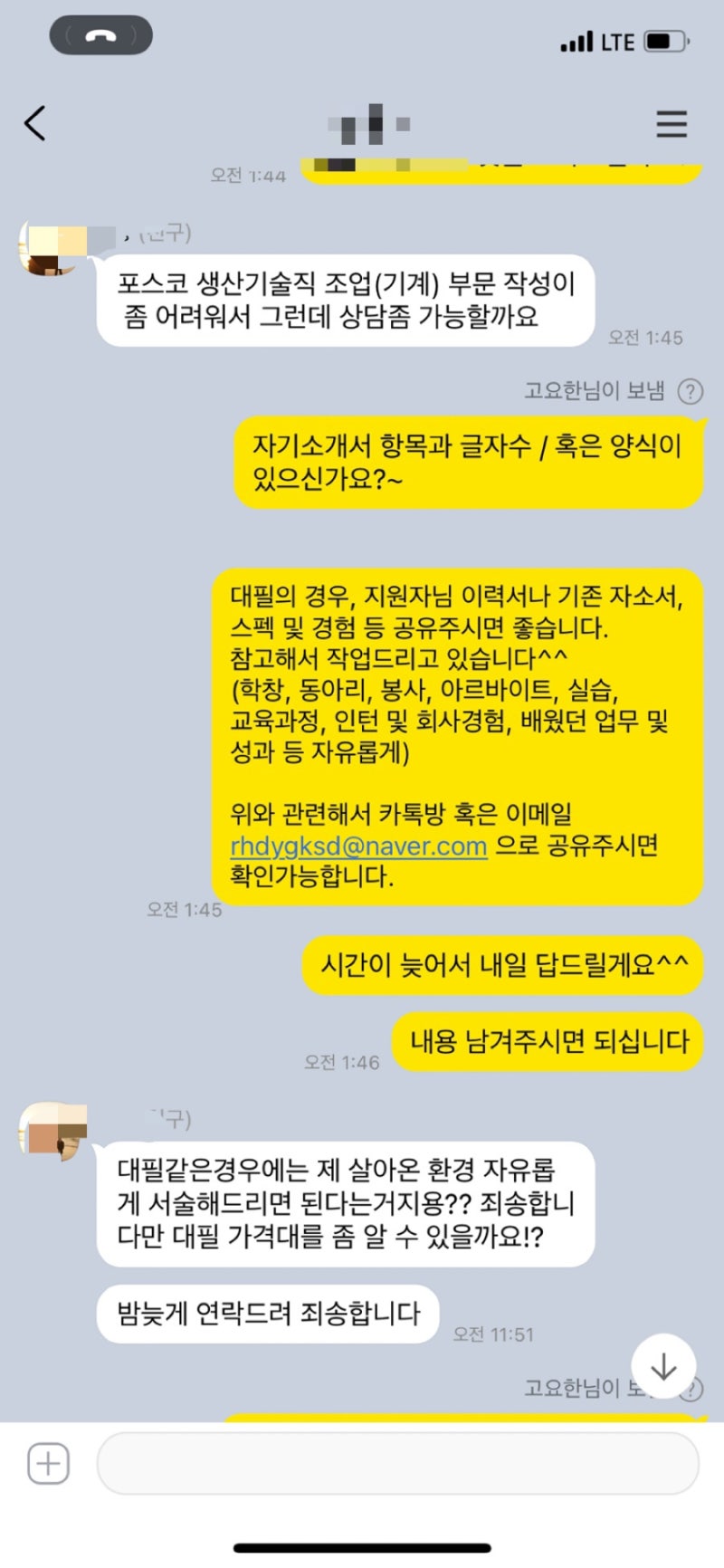 자기소개서 첨삭부터 작성 대필(대행), 학업계획서, 경력기술서 및 직무수행계획서, 그리고 면접 컨설팅까지! 취업의 모든 과정을 저와 함께하시면 든든하실 거예요! 😊