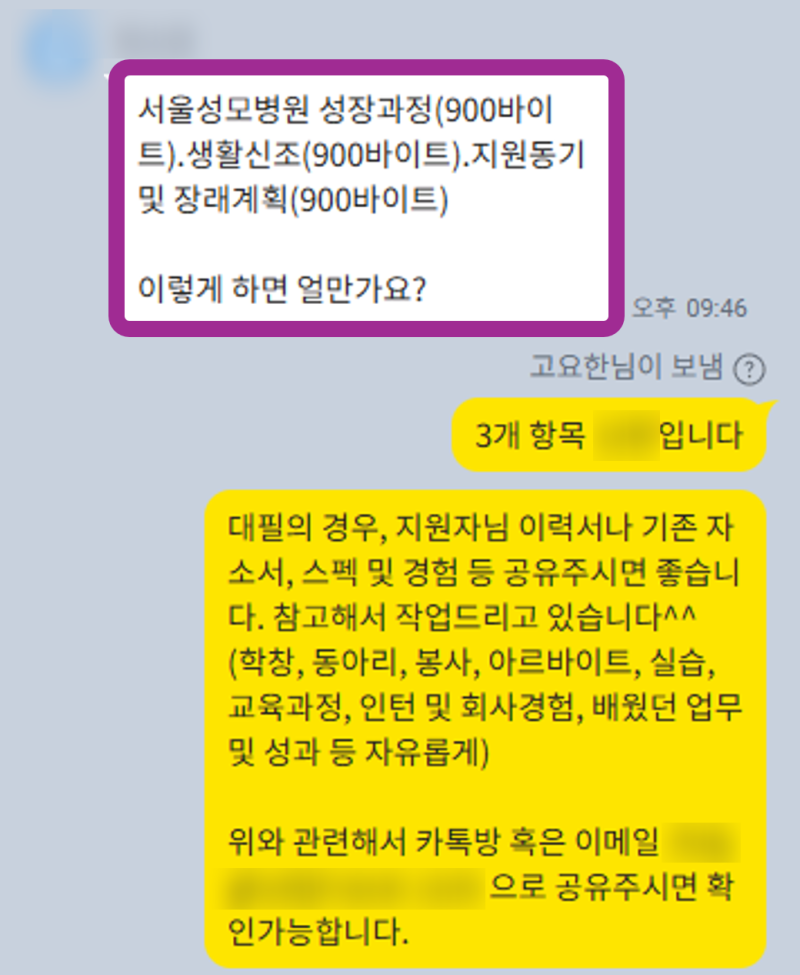 • >> [1단계] 문의 및 자료 공유: 지원 희망 공고, 이력서, 기존 자소서 등 필요한 자료를 저에게 공유해주세요.