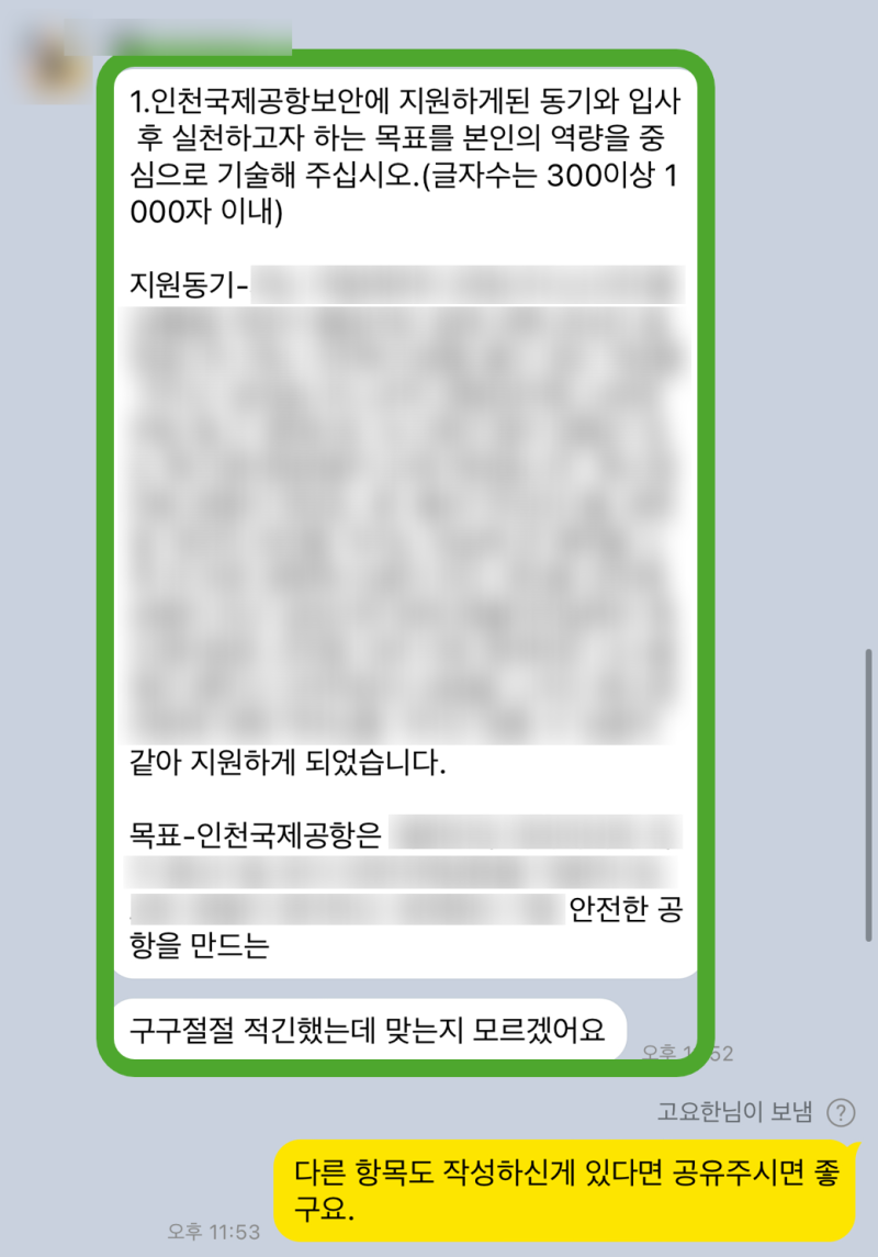 수정 전 지원자분의 자기소개서는 경험의 나열에 그쳐, 자신이 왜 이 직무에 적합한지에 대한 설득력이 부족했습니다. 하지만 수정 후에는, 각 문항마다 인천국제공항보안의 핵심 가치와 직무 역량이 자연스럽게 녹아들어, 마치 오래전부터 이 일을 준비해온 사람처럼 느껴지도록 바뀌었습니다. 스스로도 제가 썼던 글인데, 이렇게 달라질 수 있다는 게 신기해요!라며 놀라워하셨죠.