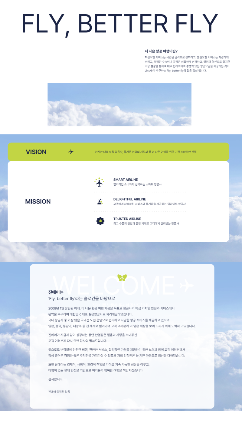 진에어는 국내 대표 저비용 항공사(LCC) 중 하나로, 합리적인 운임과 유연한 서비스로 많은 고객들에게 사랑받고 있죠! ✈️ 특히 ‘나비효과’라는 슬로건 아래 고객 중심 경영을 실천하며 안전과 편안함을 최우선으로 여기는 기업이랍니다. 젊고 활기찬 분위기 속에서 밝은 미소와 따뜻한 서비스로 고객 경험을 극대화하는 것을 중요하게 생각하는 곳이에요.