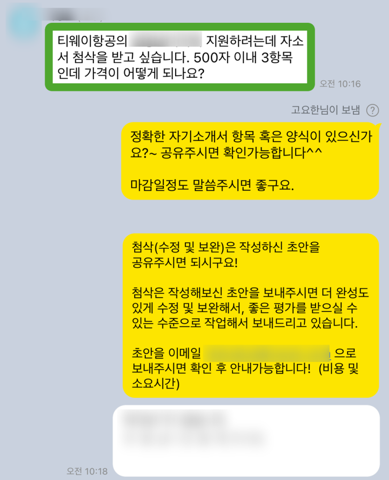 - >> [2단계] 자료 공유 및 진단: 기존 이력서, 자기소개서 초안, 채용공고 등을 공유해주시면 제가 꼼꼼하게 사전 진단을 해드립니다.