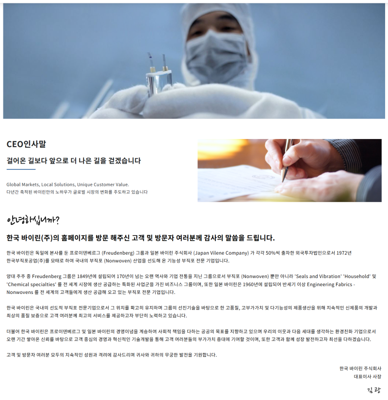 - 비전: 부직포 및 기능성 소재 분야의 글로벌 리더, 지속 가능한 미래를 위한 혁신 주도