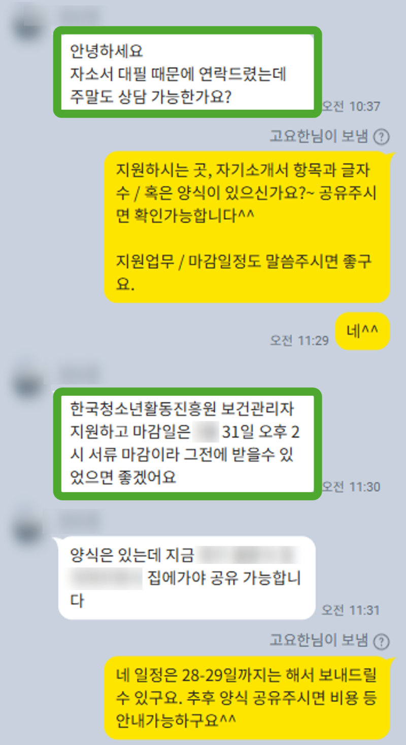 특히, 기관의 미션과 비전을 자신의 경험과 어떻게 연결해야 할지, 그리고 지원하는 직무에서 요구하는 역량을 구체적인 사례로 어떻게 풀어내야 할지에 대해 많은 고민을 하고 계셨어요. 솔직히 말씀드리면, 처음에는 ‘경험은 많은데 이걸 어떻게 녹여내야 할지 막막하다’는 말씀을 많이 하셨습니다. 저 역시 그 마음을 충분히 이해했기에, 지원자님의 강점을 최대한 살리면서도 한국청소년활동진흥원의 인재상에 부합하는 매력적인 자기소개서를 완성하기 위해 함께 머리를 맞댔죠.