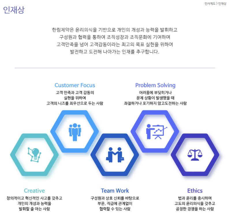 #7. 한림제약 분석 자료: 핵심 가치, 비전, 인재상