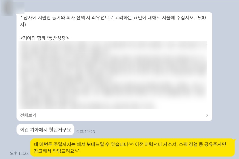 - >> [2단계] 자료 공유: 이력서, 기존 자기소개서 초안, 희망 직무 등 필요한 자료를 저에게 공유해 주세요.
